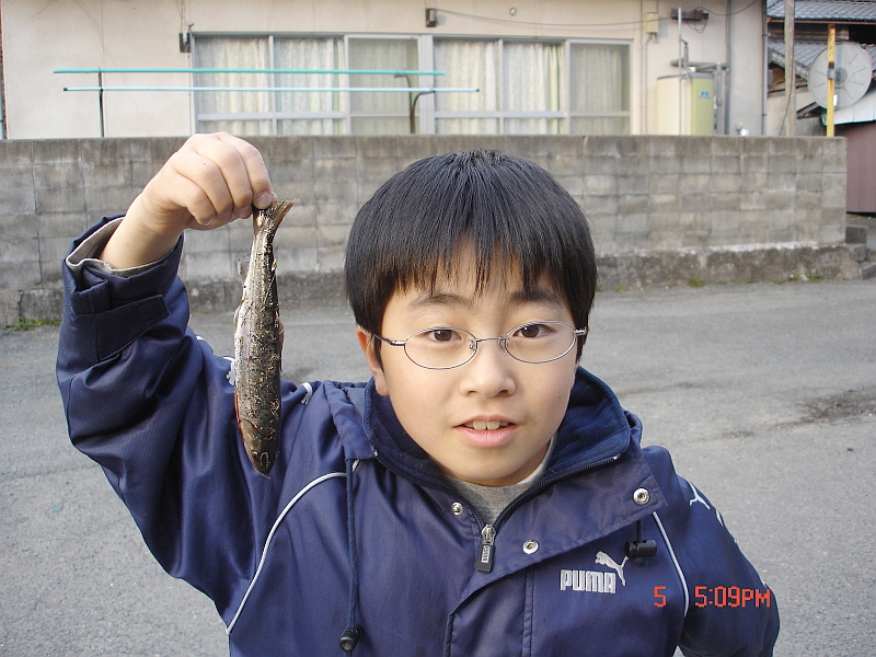 90度カーブにタモを探しに行くがなし。子供達が釣りたいというので中学裏に向かおうとしたが、途中でバス格納庫が釣らせ易いと思い、そこで竿を出させる。するとなんと、ちひろが23センチクラスを引き抜いた。かと思うと昂も21センチ級を引き抜いた。なんとなんとこの子達は必ず何かやってくれる。これで4人が1匹ずつで、みんなが嬉しい釣果となった。その後、中学裏にも行ったが釣れなかった。
