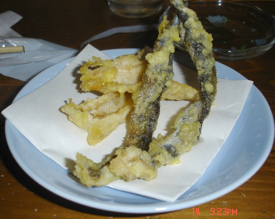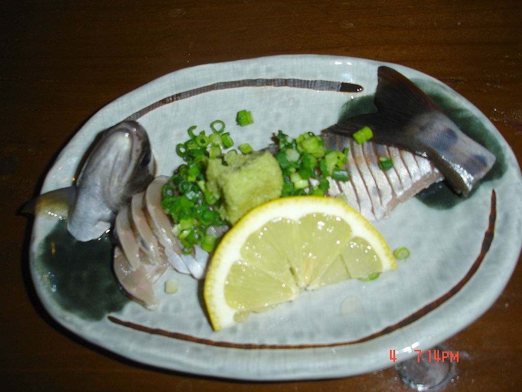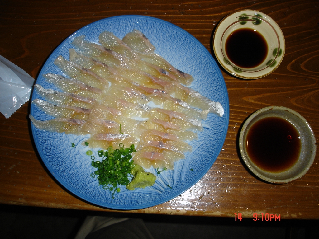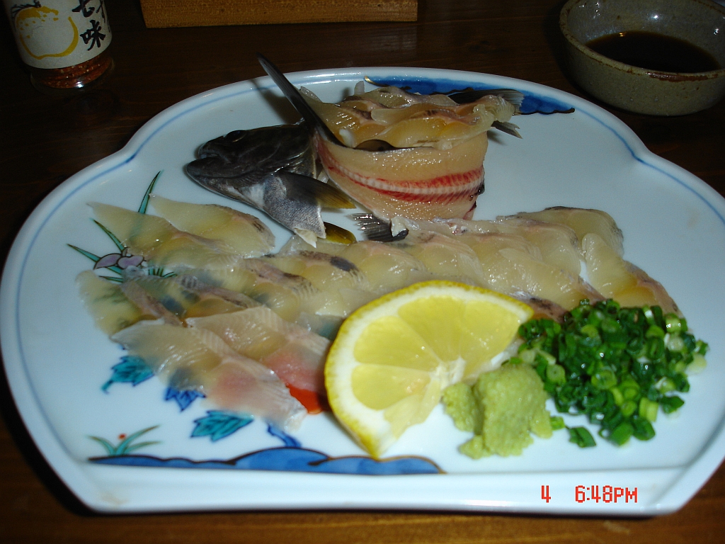 その後、久住村役場に車を止めてミミズを購入。(結局、パックを開けることは無かった。) O病院裏。水量が少なすぎてみるからに駄目。川虫増量。ヒラタはほとんどいない、クロ川虫多し。ダム上流の90度カーブで、鮎カンを流水に浸してから御前湯でリラックス。客が多いが、温泉は気持ちいいなぁ。温泉から出て、三星と敬三叔父に電話。山女の刺身を誘うが、それほど乗り気ではなかった。このあと湯平方面を探索。降りやすい場所が合った。少し先まで行って、仮眠を取る。眠かった。その場所に戻って竿を出す。良さそうな場所だが釣れず。鮎カンを回収したのち、たまりで竿を出す。当然のように釣れない。浅瀬に鯉がたむろしていた。で、待ちに待った山女を生かした状態での刺身を食べるため三星へ。マスターが駐車場に子供といた。 早速調理してもらう。山女の身は生きているのを捌いても、前回と同じくらい甘かった。マスターは、前回の既に死んだ魚を裁いたときと全然違ってコリコリしているでしょ?、と言ったが、そうでもなかった。コリコリした感触は確かに四国で初めてアマゴの刺身を食べたときにそうだったので、どんなものかわかっているつもりだ。でも今回はかなり努力して生かして店に運び込んだがコリコリ感はなかった。なぜか不明。でもとにかく美味しくて幸せだった。さらに今日は「セゴシ」を食べた。「セゴシ」とはよく耳にはしていたがどんなものかは知らなかった。要するに、ブッタ切りだ。これがうまい!刺身では体験できなかったコリコリ感を見事に味わうことができた。骨が気になる人もいるそうだが、自分は気にならなかった。ただ、セゴシにするにはもっと小さい山女が良さそうなので、小物でもキープして次回からセゴシで食べよう。そして骨せんべいと、皮の唐揚げ、骨の唐揚げも食べた。