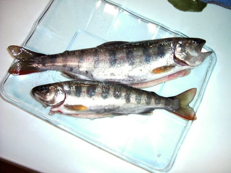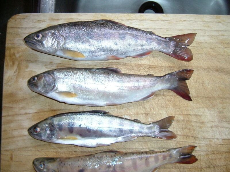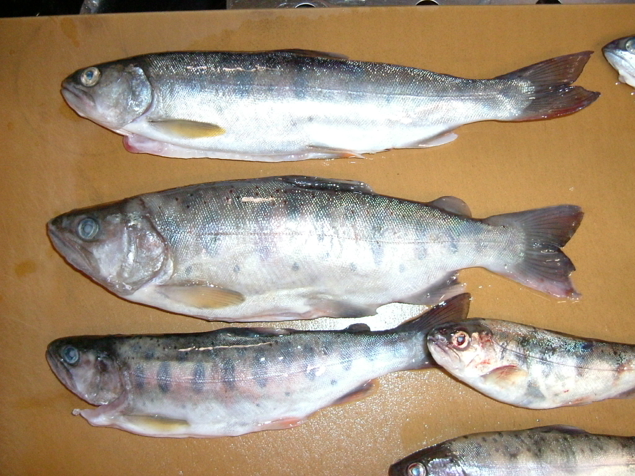 本郷さんによると、身が赤いのは、すぐに氷で冷やすとかいうのとは関係なく、魚の年齢だそうだ。つまりこの魚は大きさの割に年齢の進んだ魚で、住処にエサが少なかったから体が大きくなっていないだけだそうだ。そうした魚の特徴は目が大きいらしい。目だけは年齢と共に大きくなるので、体に比べて目だけが大きくなるらしい。つまり、エサが豊富にある場所なら十分尺物になっていたはずのヤマメであった。これまで34センチを釣ったときでも、36センチですらこれほど身の赤かったことはないから、今回釣れたヤマメは順調ならば40センチを超えていたかもしれないのだ!!(あはは、釣り馬鹿ね)。