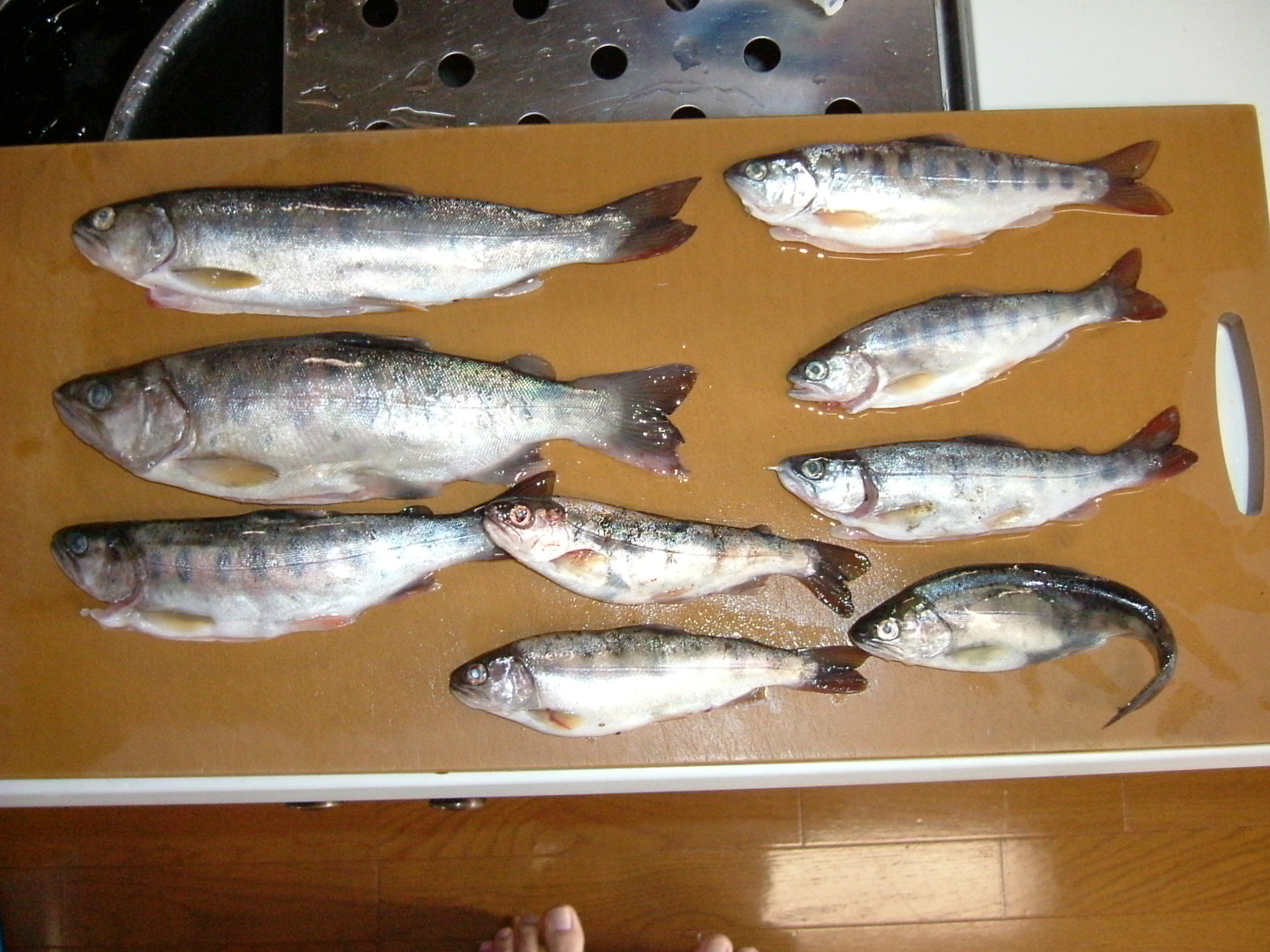 これは先の大きめサイズより、二回りくらい体ががっしりしていて、鼻が突き出ている素晴らしい雄の成魚だった。形は36センチの大物を思い出させる。田んぼで作業をしていたおじさんが盛んに話しかけてきた。さらにこの川の下流のA級ポイントで大物をねらう。小物がスレで釣れ、放流。次にややそれより大きめがまたスレで釣れたので確保。やや下流を攻めるが、またしても放流サイズ。大物はいないと判断して、撤退。おなかが空いたので、川床の田北商店へ移動。やきそぼUFOを作ってもらって朝飯とする。おにぎり・パンなどはなかった。おばさんと楽しく会話。紙漉橋のポイントで1匹ゲット。もう普通サイズは満足してので、お昼休憩を取って夕まずめの尺物ねらいに絞ることにした。直入へ移動。温泉へ。今回は10回目だったので、入浴料が無料になった。 (^o^)v。その前に桃太郎寿司で昼飯。うどんとさしみまでサービスしてくれた。何回も来たが開いていなかった、と言ったので気を遣わせてしまったか?3階の風呂は修理中で、女性は家族風呂利用になっていて、200円だったようだ。今回は仮眠室を使わず、食事をする場所で横になった。3時前に御前湯を出て、駐車場で仕掛けを二組作る。そしてたまりへ。凄く良い感じの流れ、水の色だったので、せっかく駐車場で作った0.6号の仕掛けは使わず、0.8号の仕掛けを作り直した。来るなら超大物の予感がした。でも結局予感(=期待)倒れで、かかったのは20センチ級の小物。続いて更に小物。これは放流。早く尺物になってその時、私に釣られておくれ。一旦退却。その場に6m竿とタモを置いたままにして、上流の90度カーブへ。横の田んぼは台風の影響か、すべて稲が倒れていた。同じ田んぼでもなぎ倒された一面と全く影響を感じさせない田んぼがあって不思議だった。場所によっては部分的になぎ倒されている田もあった。とにかく90度カーブ。ここは雑草がキレイに刈り取られていて、ポイントへ仕掛けは出しやすくなっていた。しかし釣れなかった。そして再びたまりへ。今度は駐車場で作っていた0.6号の仕掛けを使った。でも駄目。流木に引っかけたので諦めて帰路につく。ちょうど小雨が降り始めた。そしてそれば土砂降りとなり、ラムネ温泉横で魚を捌こうと思っていたのに出来なくなった。結局小国の禁漁区が始まる場所まで行って捌いた。しかし時間が遅く、途中で暗くなってきたので、数匹捌かないままあわてて土手に上がった。もう真っ暗だった。日田の大望でいつものスタミナ定食。おばさんはこちらの顔を覚えているようで、スタミナ定食を頼んだときかすかに笑った。小石原の道の駅で15分ほど休憩。今回の釣果。