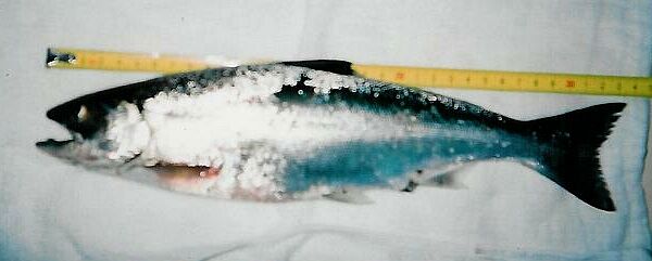 夜は、興奮して眠れない。翌朝、20センチ、尾の部分、スレ。 食堂で手作り朝食。土筆取りをした後、黒川温泉の「山河」で、温泉に入る。木の花ガルテンで、コーヒーブレーク。4人でワールドに計量に行く。計るとなんと32センチしかない。ガーーン!これじゃー、不満が残る。後日写真を見せると言うと、信用してくれて、記録を33センチにしてくれた。この写真は、今回デジカメを忘れ、「写るんです」で撮影したため、写りが悪いが、33センチは超えているのがはっきりわかるし、実はこの段階で死後硬直をしているので、私としては釣った直後は34センチあったと信じている。苦しい??まぁ、釣り上げた人の気持ちはこんなものです。^^;))