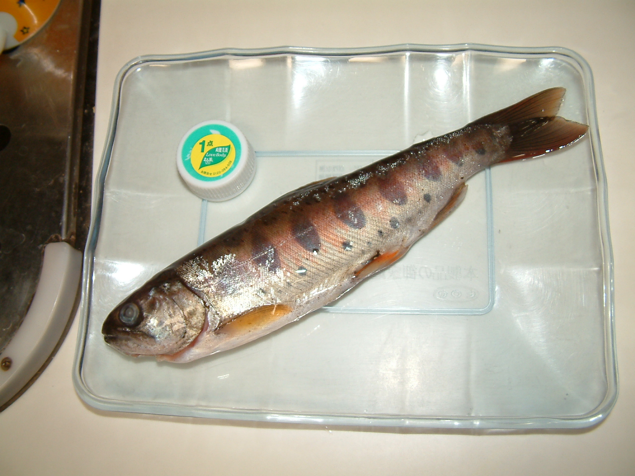 とにかく、今回の釣行である。妻は金曜日朝から東京に出張で、できたら夕方から子供達はおばあちゃんに預けて、土曜日の朝まずめから釣りたかったのだが、おばあちゃんも用事があって、土曜日の朝に出発。なぜか、タモがなくなっていて、店で敬三叔父のタモを借りてゆく。馬借のセブンイレブンで氷を買い、採銅所の太陽石油で給油。現金で91円だった。松原ダムのレストランでカツ丼を食べる。頼んでから持ってくるまでえらく待たされた。再出発が12時前。瀬の本で右折し、玉来川上流から竿を出すことにした。ここでウエイダーに履き替える。アタリ無し。次にいつかも挑戦した岩の割れ目に再挑戦。アブラメしかいない。最後に岸に上がろうとするとき、深みで転んで両足を強打。水が腰から少し入ってきて、ちょっと恐怖感を味わった。すねなどすりむいて、どうも血が出ている感触があるが、大したことはなさそうなので、ウエイダーを脱いで確認することはしない。それからバス格納庫へ。3つある流れの真ん中でヒット!エサはブドウ虫。20センチある。まずまずの型だ。 (^o^)v これで坊主はなくなった。次に90度カーブ。これも3つ流れがあるが、一番奥で強烈なヒット!小さめの竿を使っていたせいもあり、強い手応えを味わう。さて取り込み、というときに、2年前を再現するかのようにまた仕掛けを枝に引っかけてしまった。焦る、焦る。^^;) よく見ると針を飲み込んでいるようなので、「落ちない、落ちない」と言い聞かせて冷静に糸をたぐり寄せようとする。しかし、とどかない。しかたなく足を一歩踏み出すと、またしても「ズボン!」また深みにはまってしまった。再びやや恐怖感。一方魚は最後の力を絞って暴れ出す。逃がしてなるものか!27センチくらいありそうだ。こんな型は今回もう釣れない可能性が高い。逃がすものか。で、なんとかかんとかでようやくゲット!ああ、良かった。順調順調。ここで写真撮影。最近は尺物でないと写真に撮ろうとしなかったが、今シーズンは釣れなかったし、やはり記録として小振りでも撮影しておきたくなった。