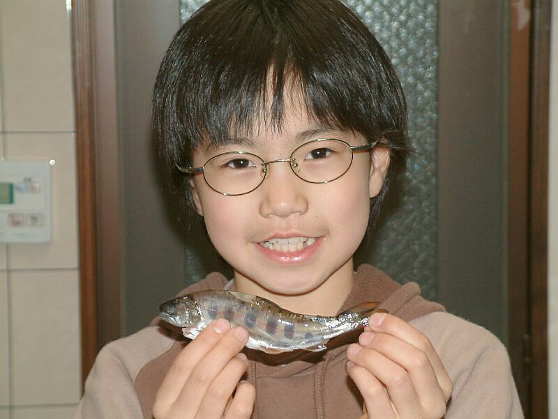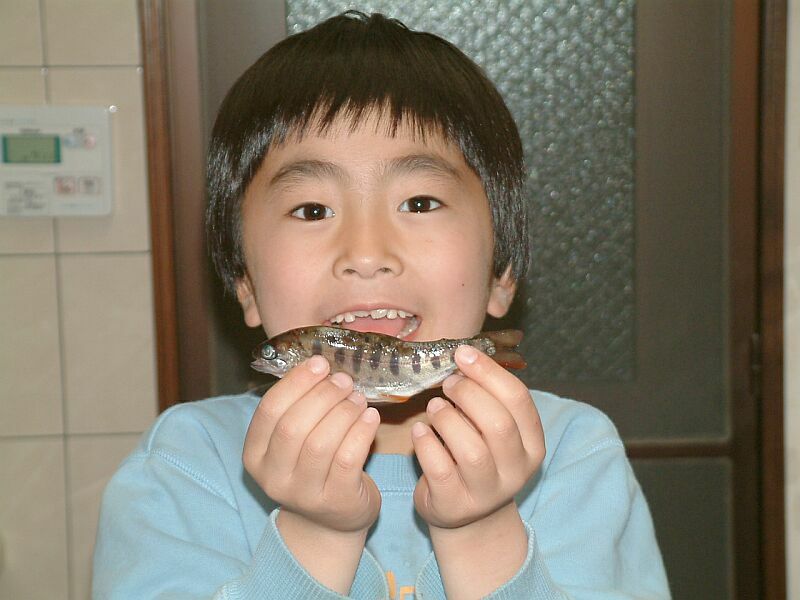 ということで、本命の尺物ねらいへ。でも、ダメでした。帰りに添ヶ津留の3本流れによったがダメ。そして以前から気になっていた旗返しで竿を出すが、ダメ。木の花ガルテンで例によってカレーを食べ、少しおみやげを買って、行者杉で30分、仮眠を取って、長行には3時30分到着。6匹を捌いて帰宅。このとき、デジカメとゆずごしょうを忘れてくる。子供達は車の中で爆睡。