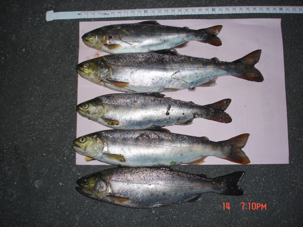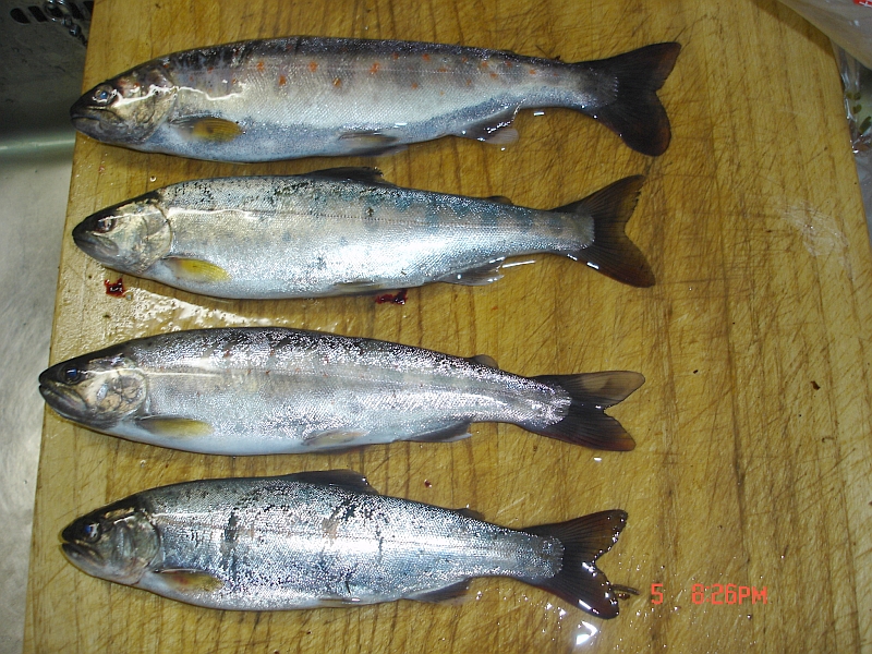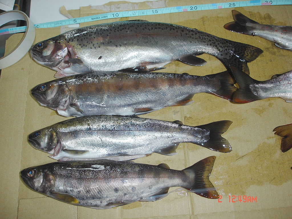 素晴らしい、絵に描いたような取り込み、素晴らしい。おお、デカーイ、ああああれぇ?ニジマスじゃんかぁーーーー、ガクっっ。しかし、でかい。30センチ確実にありそうだ。しかも太い。針はきれいに口にかかっている。この状態なら道糸が切れない限りバラス心配はなかった。そして実際取り込んだ。どうするかな?放流するにはあまりの大物だな。よし、持ち帰ることにしよう。その後3匹目はおらず、最後に第1ポイントでも24センチをいきなりゲット。もう笑いが止まりません。一カ所で4匹ですよ。すべて24センチ以上。しかもそのうち3匹は新規開拓ポイント。こんな嬉しいことはないですなぁ。それでも中学裏のポイントでもう一度竿を出して、釣れなくてそれでやっと納竿。mobileガスステーション先の少し上流で3匹を捌く。ここでえさ箱を忘れていたことを思い出したので、引き返す。引き返しの道は消防車など10台近くが道に並んでいて通りにくかった。えさ箱を見つけ、リアビューカメラを最大限活用して暗闇をバックした。消防車と再度すれ違いたくないので、右に曲がる。藤ノ木経由だが、志賀商店から御湯舟温泉方向に曲がった方が近道のようなので右折。日田できれいな夜桜も見て、いつもの大望でスタミナ定食。11時45くらい帰宅。あああ、最高に楽しかった。全部で8匹でした。