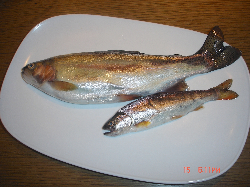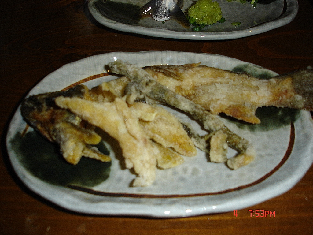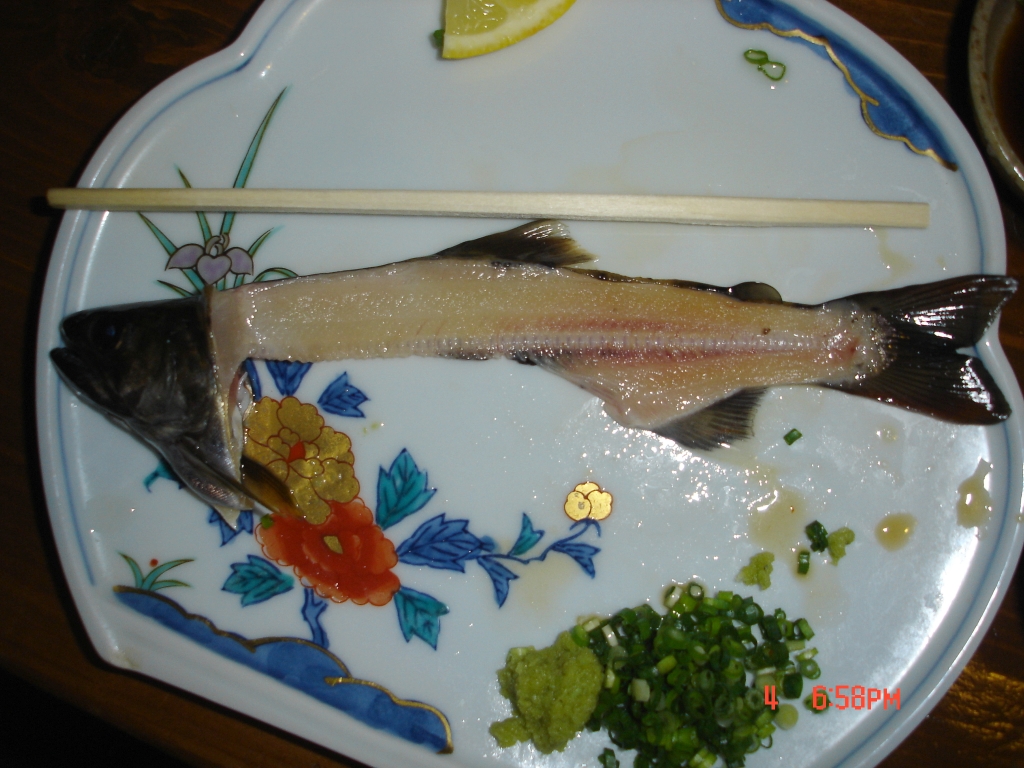 その後、久住村役場に車を止めてミミズを購入。(結局、パックを開けることは無かった。) O病院裏。水量が少なすぎてみるからに駄目。川虫増量。ヒラタはほとんどいない、クロ川虫多し。ダム上流の90度カーブで、鮎カンを流水に浸してから御前湯でリラックス。客が多いが、温泉は気持ちいいなぁ。温泉から出て、三星と敬三叔父に電話。山女の刺身を誘うが、それほど乗り気ではなかった。このあと湯平方面を探索。降りやすい場所が合った。少し先まで行って、仮眠を取る。眠かった。その場所に戻って竿を出す。良さそうな場所だが釣れず。鮎カンを回収したのち、たまりで竿を出す。当然のように釣れない。浅瀬に鯉がたむろしていた。で、待ちに待った山女を生かした状態での刺身を食べるため三星へ。マスターが駐車場に子供といた。 早速調理してもらう。山女の身は生きているのを捌いても、前回と同じくらい甘かった。マスターは、前回の既に死んだ魚を裁いたときと全然違ってコリコリしているでしょ?、と言ったが、そうでもなかった。コリコリした感触は確かに四国で初めてアマゴの刺身を食べたときにそうだったので、どんなものかわかっているつもりだ。でも今回はかなり努力して生かして店に運び込んだがコリコリ感はなかった。なぜか不明。でもとにかく美味しくて幸せだった。さらに今日は「セゴシ」を食べた。「セゴシ」とはよく耳にはしていたがどんなものかは知らなかった。要するに、ブッタ切りだ。これがうまい!刺身では体験できなかったコリコリ感を見事に味わうことができた。骨が気になる人もいるそうだが、自分は気にならなかった。ただ、セゴシにするにはもっと小さい山女が良さそうなので、小物でもキープして次回からセゴシで食べよう。そして骨せんべいと、皮の唐揚げ、骨の唐揚げも食べた。