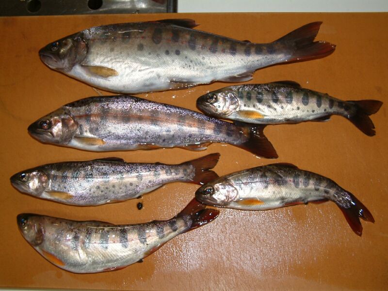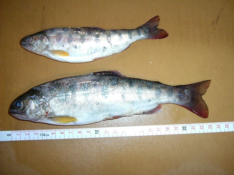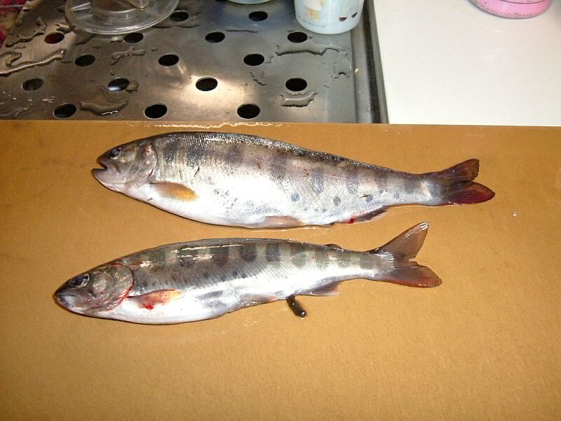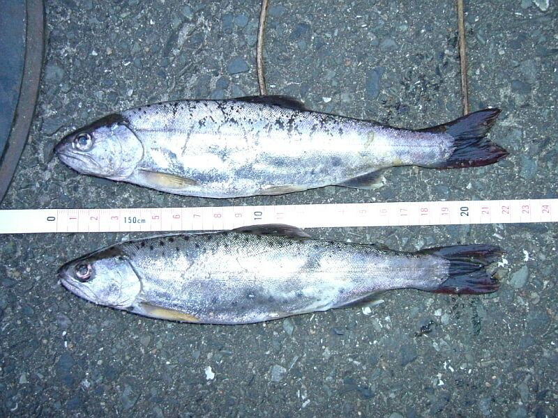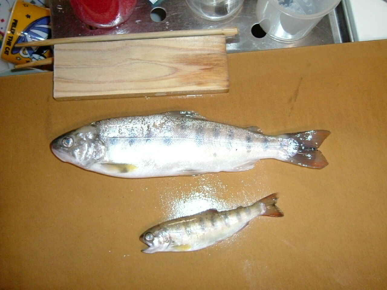 本郷さんによると、身が赤いのは、すぐに氷で冷やすとかいうのとは関係なく、魚の年齢だそうだ。つまりこの魚は大きさの割に年齢の進んだ魚で、住処にエサが少なかったから体が大きくなっていないだけだそうだ。そうした魚の特徴は目が大きいらしい。目だけは年齢と共に大きくなるので、体に比べて目だけが大きくなるらしい。つまり、エサが豊富にある場所なら十分尺物になっていたはずのヤマメであった。これまで34センチを釣ったときでも、36センチですらこれほど身の赤かったことはないから、今回釣れたヤマメは順調ならば40センチを超えていたかもしれないのだ!!(あはは、釣り馬鹿ね)。