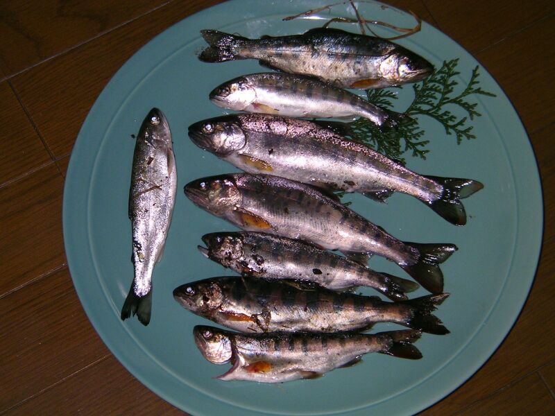 そのあと、「ちーあーポイント」も探るが駄目。敬三叔父に電話。鋭角交差点にもどり藤ノ木へ。少し山を登ったが釣りが出来そうな流れはなし。引き返す。それから小園方面へ。ものすごいポイントを発見。ガードレールをまたいで、やや危険を冒して降りる。しかし反応なし。よく考えたら二つの滝が前後にあるので、一旦釣られたら魚の供給は難しいかも。乙宮に寄るが駄目。腹も減った。産山の山水亭で、だご汁定食。帰路につく。木の花ガルテンでコーヒーブレーク。明日はタケノコ堀だといったら、「(お客さんが)タケノコ掘る?そんなイメージじゃない」と言われた。アハハ、私はシチーボーイなのだな。(x_x)\☆バキッ 小石原道の駅で小休止。ソフトクリームは5時過ぎても売っていた。蒲生のガソリンスタンドで洗車。千恵子から電話。行橋から電話があったと。釣った2匹はすぐにこの日のおかずに。いつもながら美味しかった。