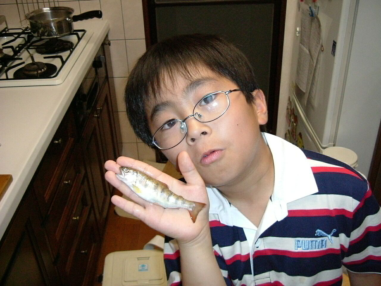 やれやれ。ページトップの「今年の目標は50センチだ」が悲しいなぁ。上記の第9戦5月末以降、今日まで3度かな、曲がりなりにも釣りに出かけたのは。6月は讃岐会議とソウルでまったく行けなかった。ソウルから帰った翌週は、体力が回復していないのを承知の上で出かけた。どこに行ったっけ?このときか次の時かはわからないが、上記第9戦で見つけたと思った「滝の下に到るルート」は上流と下流を逆に考えていた。滝の下に行くには下流に下らなくてはならないが、すぐに大きめの滝が待ちかまえていて、とても歩いて下ることはできない。残念。次は7月の中旬?ヤマメつかみ取り大会の前に一回行ったかなぁ?つかみ取り大会は子供達が絶好調で、二人で24匹のエノハを捕まえた。上手くなったものだ。それにウナギもちひろが3匹、昂も1匹捕まえた。確かこの日の夕方、たまりで、作ったばかりの0.6号の通しの仕掛けを1分ほどやりとりしたあとに、ぶち切られてしまった。第一投目だったし、おそらくヤマメだったと思う。やりとりをしていたときはヤマメと確信していた。もっとも姿を見ていないので鯉だと言われても弁明できないが。もしヤマメだったとしたら50センチ級だったな。これまで2,3度その大きさを感じさせるヤマメを逃がした経験があるし、まんざらいないこともないだろう。で、この日はなんと第2投目でも2回目のアタリが来た。しまった、先の激しいやりとりをしたあとだったが、もうアタリは来ないと思っていたので、糸を新しくしていない。この魚の引きも驚くほど強く、あっという間に下流に引っ張られて、あっけなく切れてしまった。(T_T)。これは完全にヤマメだった。水面で姿を見たから。30センチはあったと思う。ああ、もったいない。で、翌朝にもう一度挑戦して24センチを釣り上げた。その後第一ポイントでちひろは車に残して昂と二人で竿を出し、20センチ以下の小物が3匹くらいかかったが放流。最後にあきらが15センチくらいのを釣ったのでそれは持って帰ることにした。確かその時池山水源に寄って、食事をし、子供達が蜘蛛がトンボを食べる最中を目撃した。その2週間後くらいに第3回目にでかけた。幻の50センチを期待したが、たしか24センチのヤマメが最初に釣れて、最後は48センチくらいの鯉だった。