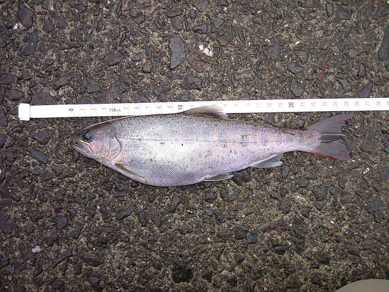 金曜日の午後、やや遅れ気味で出発。途中何台も運転の遅い車に足止めされ、到着も遅くなった。尺物ねらいの夕まずめ、またダメ。あー、嫌になる。桃太郎寿司で夕食。その後まつばで宿泊。まつばは今後素泊まり4200円らしい。今まで朝のおにぎり込みで3600円くらいだったのに、いきなりだ。でもどうやら4000円の時期があったらしい。「本当は4200円だけど、言っていなかったから今日まで4000円でいいよ。」というおばさんの言い方だった。良くわからないが、ま、これからは4200円なのだろう。じゃー、朝飯をきっちり取って5000円の安井旅館と変わらないなぁ。こうなると素泊まりの時は安井旅館の位置づけが上がってくる。「秘境の地」を探索してみるのが今回の目的であったが、なんと、鉄橋先の細い泥道が、まずぬかるんでいる。あぶない、あやうく夜須の二の足を踏むところだった。かろうじてスリップ状態から脱出。しかし両サイドから竹が道をふさいでいて、とても進むことができない。何と言うことだ。断念。で、志土知あたりの下流から攻めることに。渓相はよく、昨年大きめのイダが連れたポイントのかなり下手から攻めてみたが、まったく反応なし。がっっくり。少し上流に上がって、以前から良いと思っていたポイントへの降り口を見つけ、挑戦。これもダメ。何たることだ。工事の終わった道路を通って、炭竈へ戻る。本郷さん宅近くの大きな端には釣り人がいる模様。産山川の石の割れ目も90度カーブも、バス格納庫も、第2ポイントの下もまるで、ダメ、ダメ、ダメ。あーあーあーああー。つまんない。御前湯に戻って休憩とする。昼ご飯はラーメン隼人。仮眠室で1時間寝る。敬三叔父は、天気が悪くなりそうなので、来ないとのこと。じゃ、こちらも夕まずめを釣って帰ることにする。敬三叔父のアドバイスもあり、鶏小屋で竿を出す。ここは鳥インフルエンザの影響で、鶏舎内立ち入り禁止の看板がでていた。このポイントはいたとしても18センチクラスしかいないのだが、今回はまだ姿すら見ていないので、選んではいられない。上流から攻めていく。あ、本当は逆だね。いつもこのポイントでは気にしなかった。^^;)。で、可能性がありそうな最後のポイントで、アタリ!が、残念逃げられた。確かにヤマメのアタリだった。もう一度流すがダメ。あーあ。ところが、諦めて、上流方向へ戻っていくとき、猛スピードで上流に向かう魚影を発見!おお、ひょっとしたら?!ともう一度、先ほどは反応がなかった一つ上流のポイントでエサを流してみると、ググっっっ!やったぁ!かかった!で、サッと抜き上げる。おお、良い型!23センチのきれいなやまめだ。ああ、これで坊主ではなくなった。ほっ!良かったぁ。ゼロと1は雲泥の差だ。この後いつもの90度カーブで20センチ級が一匹。これで2匹。今回の展開から言って満足しなくてはならない。よし、帰ろう。帰って明日は、子供達を唐戸市場に連れていこう。しかし、もうポイントがなくなってしまった。尺物ポイントでこれだけ反応がないと、嫌になる。次回から違う場所を本格的に探さないと、一年間ポイントがもたなくなってしまいそうだ。