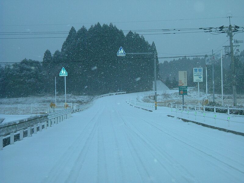 何とかチェーンをせずに瀬の本に到着。その後のまつばまでの道で2回スリップしたのでちょっとひやり。それでもチェーン無しで何とかなると判断できる程度。まつばの前も大して積もっていなかった。牧の元交差点は直進。たまりに到着。ここでまず宿を確保しようと「まつば」に電話。ところが今日は閉めるという。あれー、誤算。敬三叔父に横竹邸に泊めてもらえるよう連絡を頼むが、折り返しかかってきた電話は「安井旅館に連絡してみろ」。おいおい、横竹邸に泊まるように話を持ち出したのはそっちでしょう。^^;)ま、安井旅館が開いていたので、泊まることに。その後「たまり」で竿を出すが生命反応なし。御前湯で暖まって旅館へ行くことにした。ただ、お風呂上がりに雪が積もっていたら湯冷めしながらチェーンを巻くことになるので、予め装着。しかし雪は積もらなかったので、直入から久住までチェーンを着けたままアスファルト道路を走った。