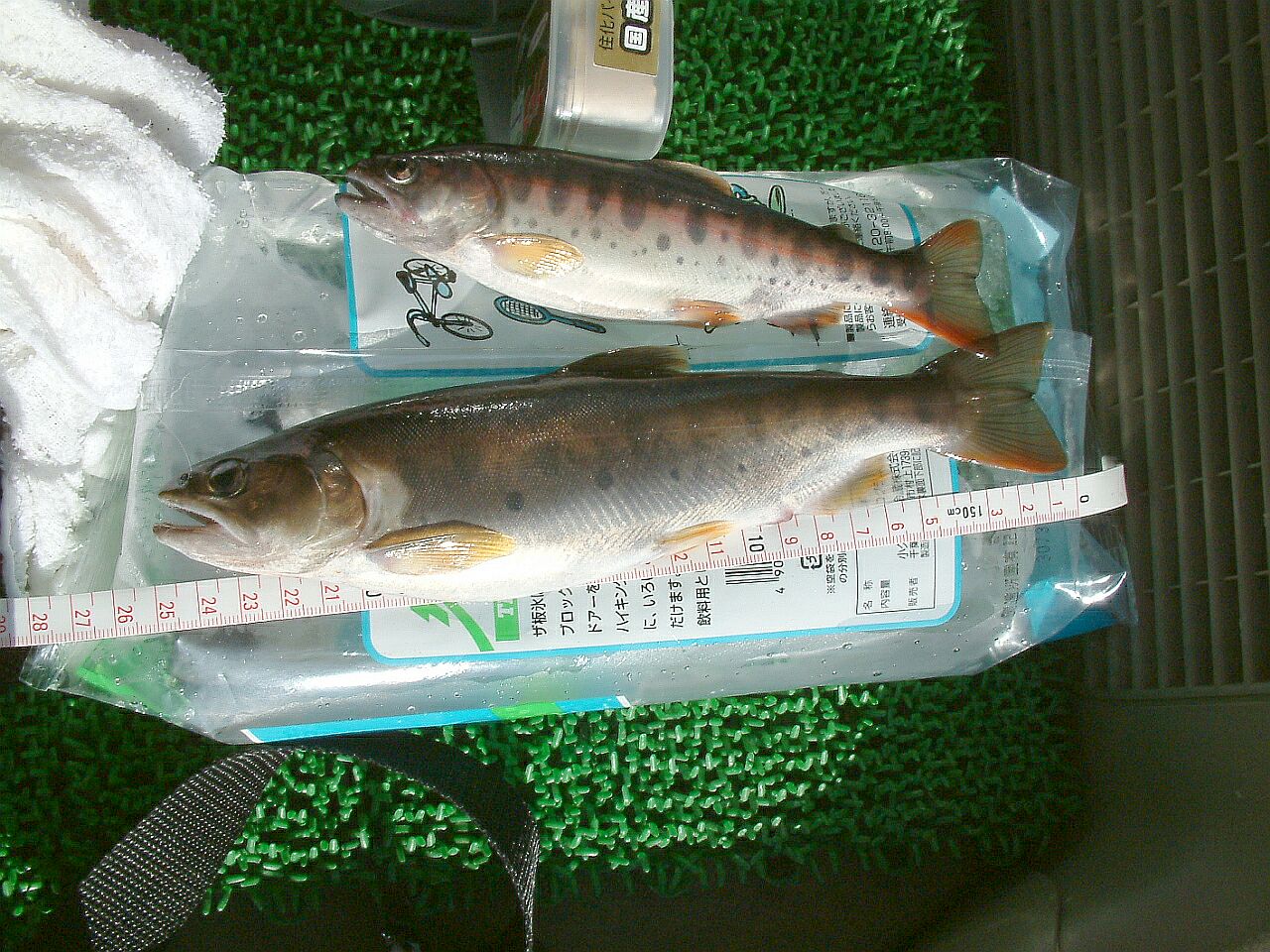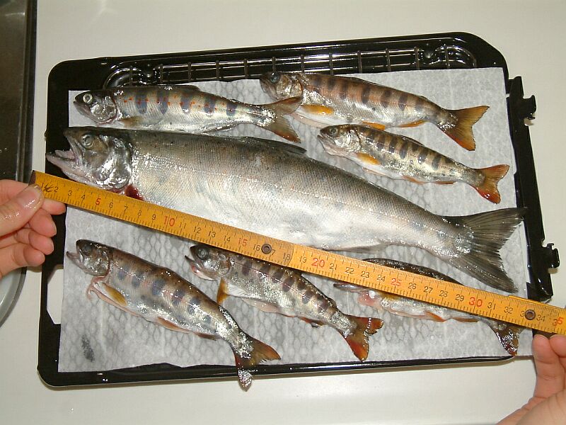 とにかく、今回の釣行である。妻は金曜日朝から東京に出張で、できたら夕方から子供達はおばあちゃんに預けて、土曜日の朝まずめから釣りたかったのだが、おばあちゃんも用事があって、土曜日の朝に出発。なぜか、タモがなくなっていて、店で敬三叔父のタモを借りてゆく。馬借のセブンイレブンで氷を買い、採銅所の太陽石油で給油。現金で91円だった。松原ダムのレストランでカツ丼を食べる。頼んでから持ってくるまでえらく待たされた。再出発が12時前。瀬の本で右折し、玉来川上流から竿を出すことにした。ここでウエイダーに履き替える。アタリ無し。次にいつかも挑戦した岩の割れ目に再挑戦。アブラメしかいない。最後に岸に上がろうとするとき、深みで転んで両足を強打。水が腰から少し入ってきて、ちょっと恐怖感を味わった。すねなどすりむいて、どうも血が出ている感触があるが、大したことはなさそうなので、ウエイダーを脱いで確認することはしない。それからバス格納庫へ。3つある流れの真ん中でヒット!エサはブドウ虫。20センチある。まずまずの型だ。 (^o^)v これで坊主はなくなった。次に90度カーブ。これも3つ流れがあるが、一番奥で強烈なヒット!小さめの竿を使っていたせいもあり、強い手応えを味わう。さて取り込み、というときに、2年前を再現するかのようにまた仕掛けを枝に引っかけてしまった。焦る、焦る。^^;) よく見ると針を飲み込んでいるようなので、「落ちない、落ちない」と言い聞かせて冷静に糸をたぐり寄せようとする。しかし、とどかない。しかたなく足を一歩踏み出すと、またしても「ズボン!」また深みにはまってしまった。再びやや恐怖感。一方魚は最後の力を絞って暴れ出す。逃がしてなるものか!27センチくらいありそうだ。こんな型は今回もう釣れない可能性が高い。逃がすものか。で、なんとかかんとかでようやくゲット!ああ、良かった。順調順調。ここで写真撮影。最近は尺物でないと写真に撮ろうとしなかったが、今シーズンは釣れなかったし、やはり記録として小振りでも撮影しておきたくなった。