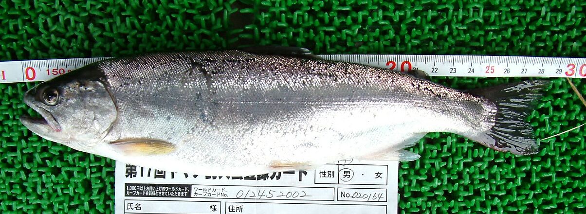 夜は、興奮して眠れない。翌朝、20センチ、尾の部分、スレ。 食堂で手作り朝食。土筆取りをした後、黒川温泉の「山河」で、温泉に入る。木の花ガルテンで、コーヒーブレーク。4人でワールドに計量に行く。計るとなんと32センチしかない。ガーーン!これじゃー、不満が残る。後日写真を見せると言うと、信用してくれて、記録を33センチにしてくれた。この写真は、今回デジカメを忘れ、「写るんです」で撮影したため、写りが悪いが、33センチは超えているのがはっきりわかるし、実はこの段階で死後硬直をしているので、私としては釣った直後は34センチあったと信じている。苦しい??まぁ、釣り上げた人の気持ちはこんなものです。^^;))